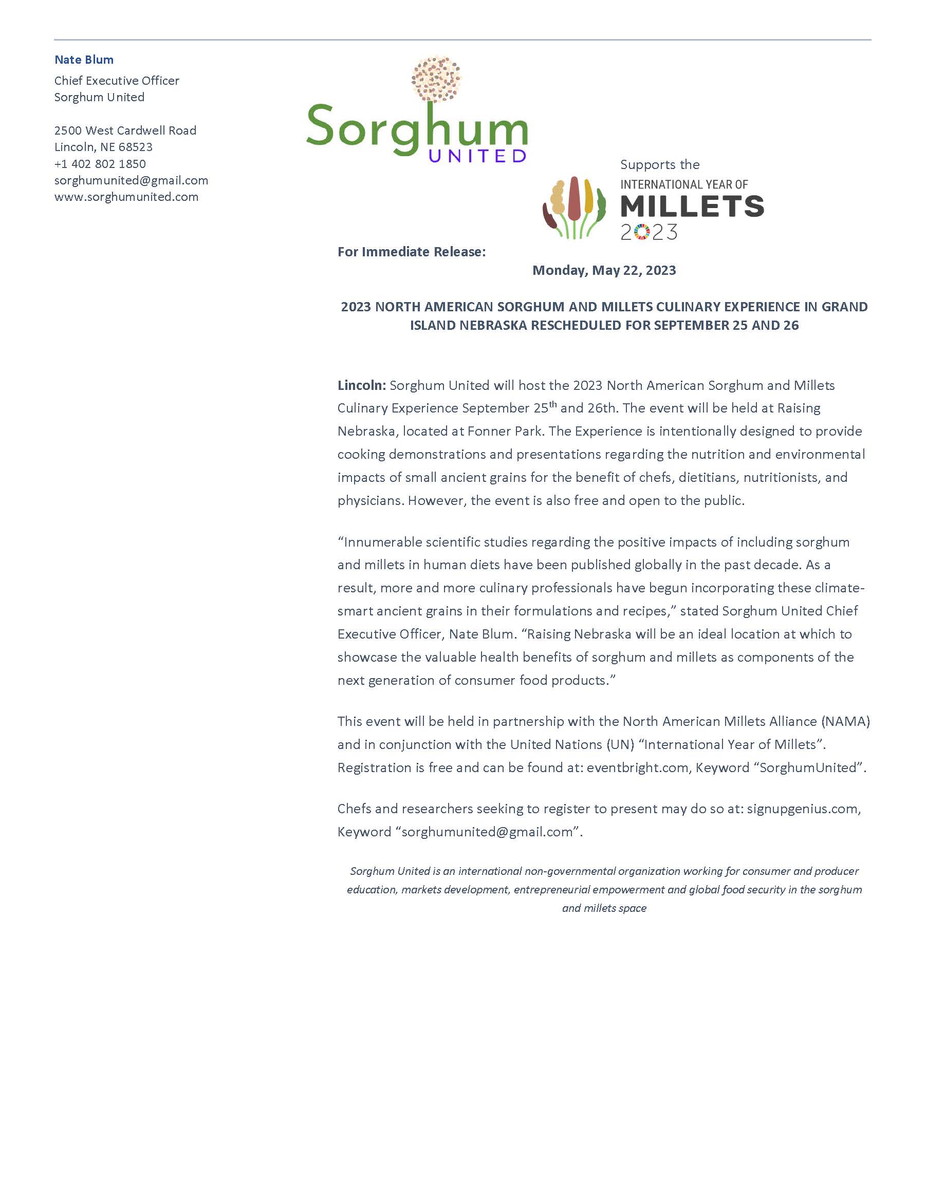 Please note the new dates in September! DO, EL, MI, US NAMA ---------- Forwarded message --------- From: Sorghum United <sorghumunited@gmail.com> Date: Tue, Jun 20, 2023 at 7:39 AM Subject: For Immediate Release: 2023 North American Sorghum and Millets Culinary Experience Rescheduled for September 25 and 26 To: Sorghum United <sorghumunited@gmail.com> Nate Blum Chief Executive Officer Sorghum United 2500 West Cardwell Road Lincoln, NE 68523 +1 402 802 1850 sorghumunited@gmail.com www.sorghumunited.com Supports the *For Immediate Release: * *Monday, May 22, 2023* 2023 NORTH AMERICAN SORGHUM AND MILLETS CULINARY EXPERIENCE IN GRAND ISLAND NEBRASKA RESCHEDULED FOR SEPTEMBER 25 AND 26 *Lincoln:* Sorghum United will host the 2023 North American Sorghum and Millets Culinary Experience September 25th and 26th. The event will be held at Raising Nebraska, located at Fonner Park. The Experience is intentionally designed to provide cooking demonstrations and presentations regarding the nutrition and environmental impacts of small ancient grains for the benefit of chefs, dietitians, nutritionists, and physicians. However, the event is also free and open to the public. “Innumerable scientific studies regarding the positive impacts of including sorghum and millets in human diets have been published globally in the past decade. As a result, more and more culinary professionals have begun incorporating these climate-smart ancient grains in their formulations and recipes,” stated Sorghum United Chief Executive Officer, Nate Blum. “Raising Nebraska will be an ideal location at which to showcase the valuable health benefits of sorghum and millets as components of the next generation of consumer food products.” This event will be held in partnership with the North American Millets Alliance (NAMA) and in conjunction with the United Nations (UN) “International Year of Millets”. Registration is free and can be found at: eventbright.com, Keyword “SorghumUnited”. Chefs and researchers seeking to register to present may do so at: signupgenius.com, Keyword “sorghumunited@gmail.com”. *Sorghum United is an international non-governmental organization working for consumer and producer education, markets development, entrepreneurial empowerment and global food security in the sorghum and millets space* -- *Nate Blum* Chief Executive Officer Sorghum United +1 402 802 1850 sorghumunited@gmail.com