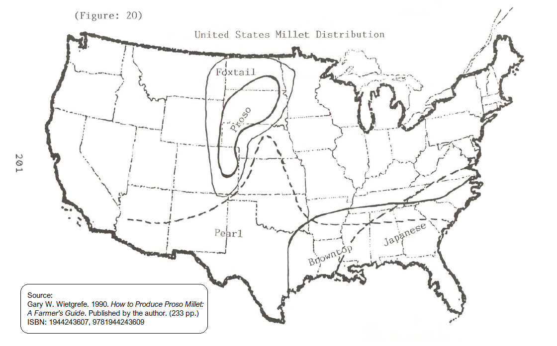Thank you, Gary, this is helpful. I have the impression that the appellation Echinochloa crus-galli (var.) frumentacea is fairly old, so any confusion would not be your fault. A USDA guide has it listed as an "alternate" scientific name for E. esculenta./1 On the other hand, the GRIN database has this same name as a synonym for E. frumentacea,/2 The scientific namespace for these species is challenging, so as not to say confusing. However, the various and sometimes overlapping common name usages are even more so, with that of "Japanese millet" seeming to me to be particularly problematic (as a sometimes catch-all) I personally (again, without claiming any expertise) found it useful to think of the two lines as "Japanese barnyard millet" (E. esculenta) and "Indian barnyard millet" (E. frumentacea)./3 /4 The latter seems to be produced for food, primarily in India, much more than the former, but in the US is sometimes called "billion dollar grass." In the US, as you point out in your book,/5 and which I noted also in the USDA descriptions,/1 /6 these species are grown primarily for forage and wildlife. It looks like the seed that you note is available in the US from Johnston Seeds and Specialty Seeds, is mainly intended for these uses. As far as I can tell, most "barnyard millet" in food products is Indian barnyard millet (E. frumentacea), and is produced and packaged in India./7 One would assume that food grade Japanese barnyard millet (E. esculenta) is still cultivated in parts of Japan. It is apparently also grown in Europe for grain for food,/8 /9 although it's hard to be certain about the species. I'm personally wondering if food grade E. esculenta might be a potential crop for the conditions of the more humid areas of northern US and southern Canada./10 Finally, a couple of comments about the map (fig. 20) on p. 201 of your book/5 (a copy of the map is attached). First, it is helpful to have such overview maps of millets in North America, even though this is now over 3 decades old. Second, I'm noting from your source for Japanese millet's placement on the map, that even though this millet may be most grown in the SE US, it is also present across the continental US. I'd be curious to know how its distribution compares, say, with E. frumentacea (to the extent one can be clear that names in different sources are being used in a consistent way). Anyway, that's a lot more detail than I had intended to get into. However, it's useful to try to clarify some of the nomenclature and verify that there are indeed two main cultivated species of Echinochloa, before we get to talking about "barnyard millet(s)" as millet-of-the-month in July. All the best, Don DO, EL, MI, US NAMA Notes: 1. See the USDA plant guide for E. esculenta - both under alternate names and a couple of the references dating to the 1980s: https://plants.usda.gov/DocumentLibrary/plantguide/pdf/pg_eces.pdf 2. USDA GRIN database "Taxon: Echinochloa frumentacea (Echinochloa colona Frumentacea Group)" https://npgsweb.ars-grin.gov/gringlobal/taxon/taxonomydetail?id=14828 3. The following recent article also uses this common name distinction, in the context of a very useful survey of the two "complexes," along with a third of lesser importance that I may return to later: Renganathan VG, Vanniarajan C, Karthikeyan A, Ramalingam J. "Barnyard Millet for Food and Nutritional Security: Current Status and Future Research Direction." Frontiers in Genetics. 2020 Jun 23;11:500. https://doi.org/10.3389%2Ffgene.2020.00500 PMID: 32655612; PMCID: PMC7325689. 4. The USDA GRIN database also lists these common names, citing a 1992 article by H. Scholz in Taxon https://doi.org/10.2307/1222824 . From the GRIN page on Echinochloa, at https://npgsweb.ars-grin.gov/gringlobal/cropdetail?type=species&id=224 , go to the pages for E. esculenta and E. frumentacea and select the tab "Common names" to see. 5. I downloaded it from https://www.researchgate.net/publication/284179184_How_to_Produce_Proso_Mill... 6. See discussion in the context of one particular variety of E. frumentacea at https://www.nrcs.usda.gov/plantmaterials/mspmcrb13988.pdf 7. https://www.pinterest.com/drdonosborn/millets-plural/barnyard-millet/ 8. For example, "Japanese barnyard millet grits" from a Lithuanian farm (per "Place of Origin") https://www.urbanfood.lt/en/japanese-millet-grits-500-g 9. An interesting survey in French of millets in France, posted on LinkedIn by Philippe Pointereau, mentions "millet japonais (Echinochloa frumentacea)," but without clarity as to whether and for what this is cultivated there: https://www.linkedin.com/feed/update/urn:li:activity:7075488061702168576/ 10. Interestingly, Michigan Flora notes E. esculenta in the wild - "occasionally cultivated and escaped" - in two counties in the SW of the state: https://michiganflora.net/record/2869 11. Mitchell, Wilma A. 1989. Japanese millet ("Echinochloa Crusgalli" var. "frumentacea") : Section 7.1.6, US Army Corps of Engineers wildlife resources management manual https://erdc-library.erdc.dren.mil/jspui/handle/11681/7217 On Tue, Jun 20, 2023 at 11:05 AM Joni Kindwall-Moore < joni@snacktivistfoods.com> wrote: