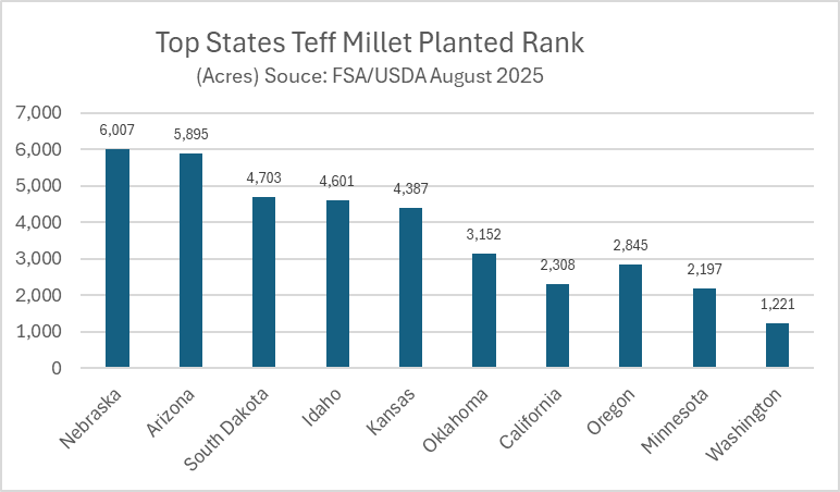 Earlier this month, Gary produced this interesting spreadsheet and set of bar graphs on the top 10 states in terms of the area planted for: millets in general, proso millet, "common millet," pearl millet, foxtail millet, Japanese millet, and teff. I produced an "article" on LinkedIn using the lists and graphics, which you can read at https://www.linkedin.com/pulse/millets-planted-us-state-aug-2025-rodkc/ His original email follows. I apologize for not sharing it here earlier - I had thought of reworking it into a different format, but ultimately its the data and not the presentation that are the priority. This kind of sharing of data is important for our understanding of the current status and trends of millets in the US and North America. DO, EL, MI, US NAMA ---------- Forwarded message --------- From: Gary Wietgrefe <g ... m> Date: Thu, Sep 11, 2025 at 1:18 PM Subject: First millet planting report FSA/USDA August 2025 Attached is a spreadsheet I developed from USDA's Farm Service Agency August report of acres planted by crop. As mentioned earlier "Common" and "Dove Proso" titles will be modified in next year's report. Graphs highlight the diversity of states by type of millet....Gary [image: image.png] [image: image.png] [image: image.png] [image: image.png] [image: image.png] [image: image.png] [image: image.png] -- Author, Gary W. Wietgrefe, https://www.RelatingtoAncients.com/ *Destination North Pole--5,000 km by bicycle* is an exciting, endearing, humorous, dangerous and sometimes quirky travel adventure. Hardcover, paperback and e-books are available on Amazon or other on-line retailers. My other books tie education, school system, parenting, technology, and business with 21st century culture and learning.