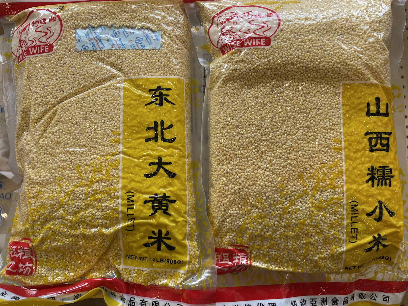 Here's the reason for asking, which gets a little technical, but bear with me. The package on the left says 大黄米 (dàhuáng mǐ), literally big yellow staple-grain, which means proso millet, and on the right, it says 糯小米 (nuò xiǎomǐ), with nuò meaning glutinous (or waxy) and xiǎomǐ literally being meaning little staple-grain, which strictly speaking is foxtail millet. So I'm wondering if the packaging company played loose with its terms, and packed glutinous proso as glutinous foxtail? I think I've seen this once before by another company.