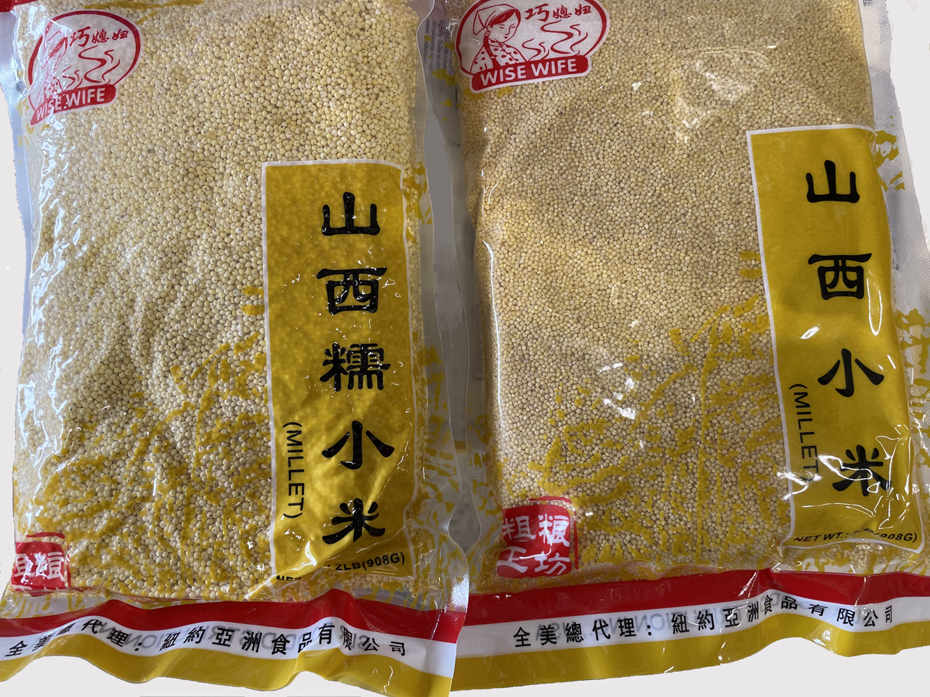 On the right is a regular foxtail (小米 nuò xiǎomǐ). Both of them come from the province of Shanxi (山西), and both are packaged by the same company under the "Wise Wife" brand.