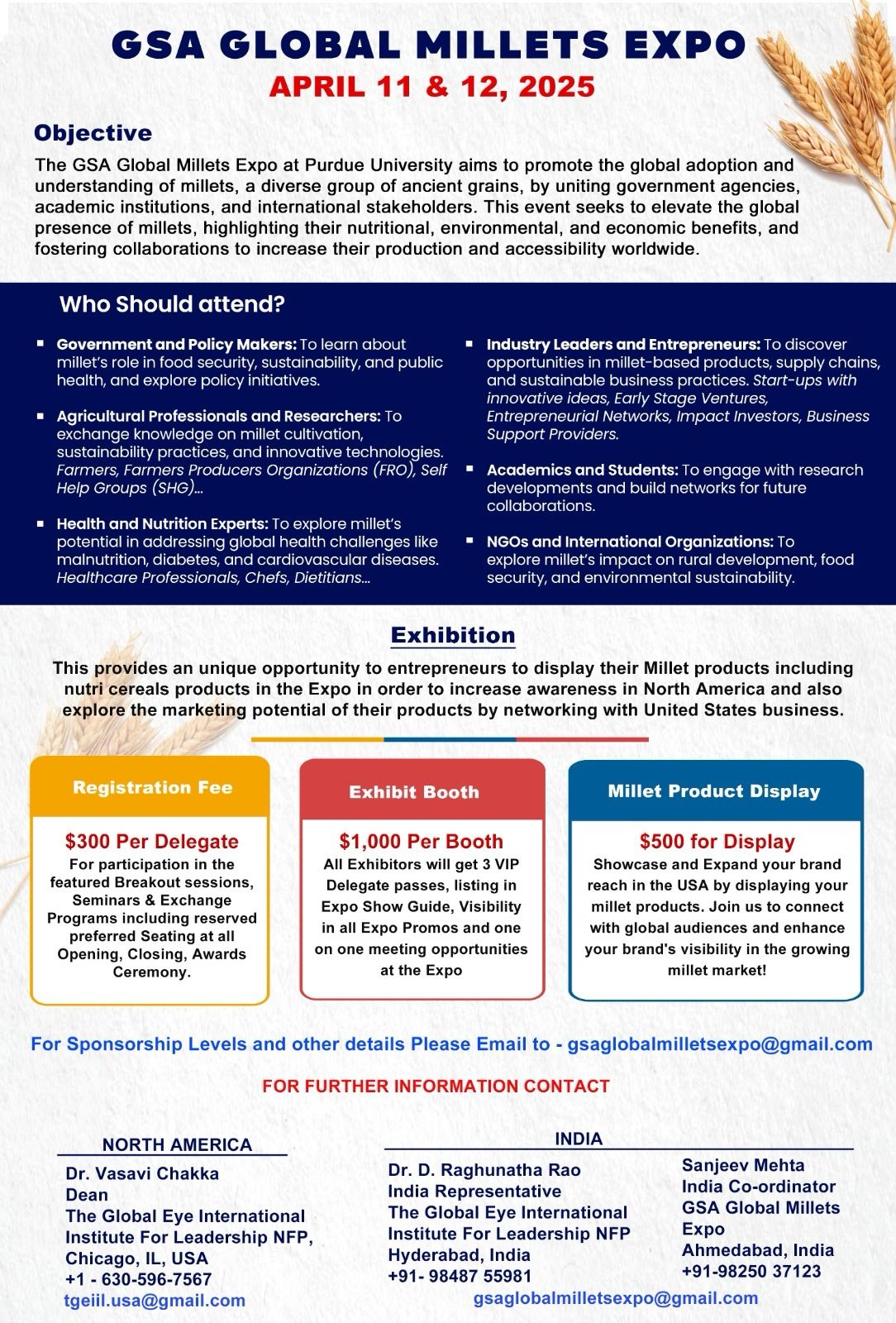 The GSA Millets Expo at Purdue University on 11-12 April 2025 has some opportunities for exhibit booths and millet product display. The attached flyer was posted by the GSA head, Dr. Vijay Prabhakar, on LinkedIn and X/Twitter. Note that the contact email addresses are different than those given on the event webpage at https://ag.purdue.edu/events/department/foodsci/2025/04/gsa-global-millets-e... . We'll pass on further info as it becomes available. DO, EL, MI, US NAMA