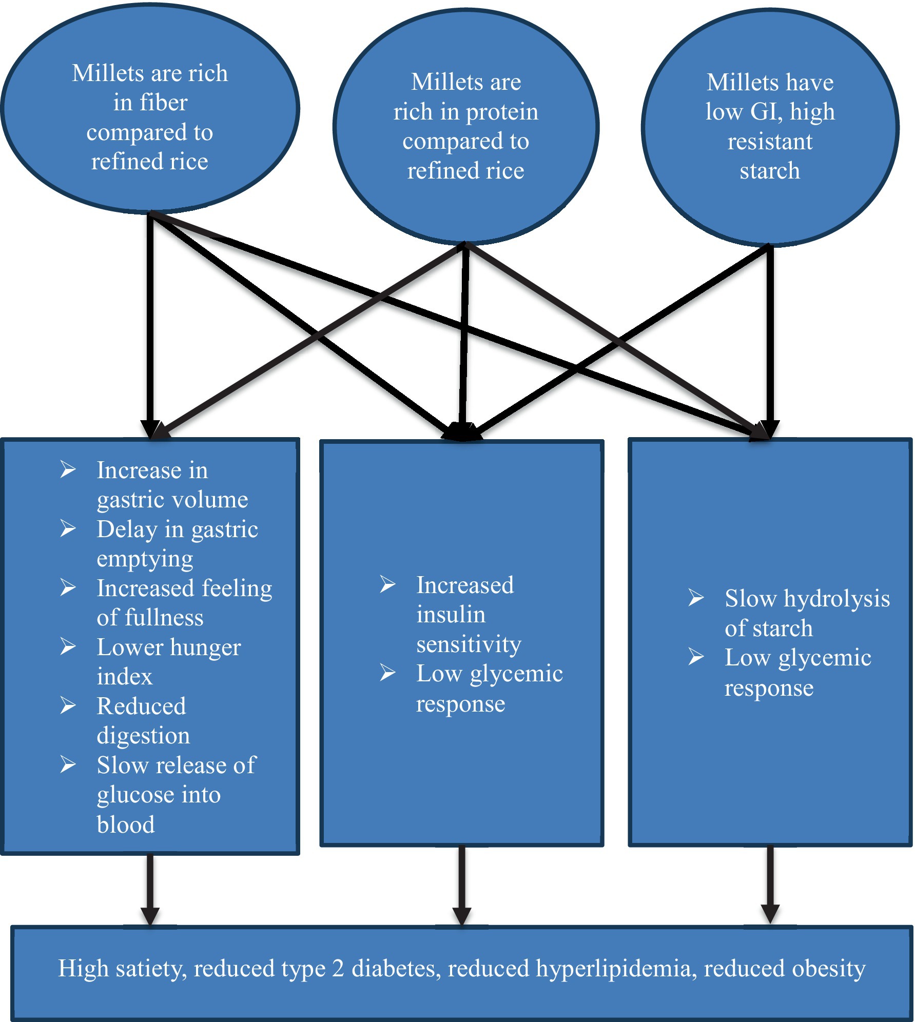 One less-discussed benefit of millets seems to be that we feel full longer after eating them than is the case with other grains. A review article last year discusses the mechanisms of this and the health implications: Anitha Seetha, Shweta Upadhyay, and Joanna Kane-Potaka, "Millets have the potential to increase satiety and reduce the feeling of hunger: a systematic review," Frontiers in Sustainable Food Systems, Vol. 8, 3 June 2024 https://www.frontiersin.org/journals/sustainable-food-systems/articles/10.33... According to the article * "Millet-based food stays longer in the stomach, thereby prolonging the feeling of satiety or fullness." * This may be due to "millets’ richness in fiber ... increasing gastric volume and prolonging gastric emptying time" * And this, in turn, delays glucose response and lowers the blood lipid profile The attached diagram, which is Figure 2 from the article, illustrates the "Proposed mechanism of action of millets on satiety and other health parameters." Don Osborn, PhD (East Lansing, MI, US) North American Millets Alliance