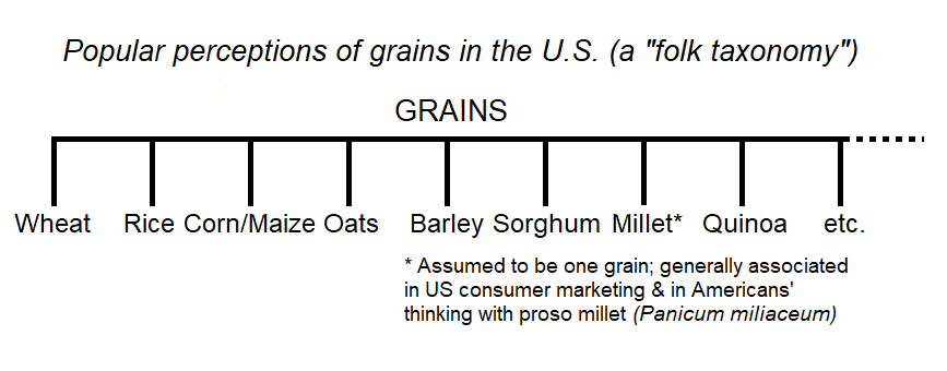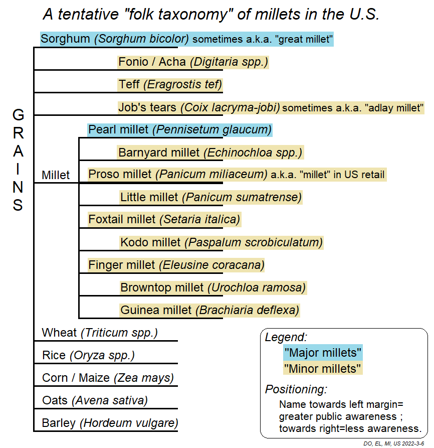 See also the image of a list of grains at this URL: https://donosborn.org/blog/other-blogs/linkedin-articles-posts/linkedin-2014... . A useful list of grain names and species, until you get to "Millet," after which there are four species names. This to me is a problem with terminology, in which one word confusingly can mean different plants. It's this kind of thing I had in mind when bringing in the ethnotaxonomy idea. (The page that was the source of the image has since edited it out, but retained a text version with "millet" followed by ... four species names: https://www.cropsreview.com/cereal-crops/ ).