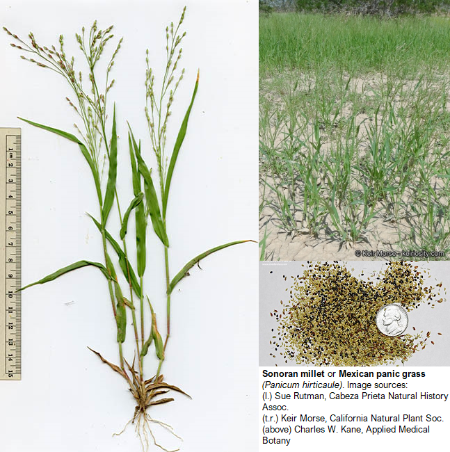 Sharing the millet-of-the-month spotlight in August with little millet (Panicum sumatrense) is its North American "cousin," sometimes called Sonoran millet (P. hirticaule or P. sonorum). Both are in the same genus as proso millet (P. miliaceum), which was the January millet of the month. Sonoran millet has been well documented as being under cultivation in what is now the SW US and NW Mexico since prehistoric times until modern times./9 /10 Cultivation now is apparently limited mainly to small farms notably of Wariho Indians in Sonora, Mexico, where it was documented as recently as 2011./11 Regarding nomenclature, it seems that P. hirticaule/12 may be used more for the wild varieties, and P. sonorum/13 for the larger and larger-grained variants that have been cultivated. However usage varies, esp. in older literature. At one point, it was thought that this grain - its cultivated variety - was extinct./11 An important range of cultivation in the Colorado River delta effectively disappeared as an indirect effect of the Hoover Dam./9 Its present status is "vulnerable."/13 There is some discussion of whether this grain is truly "domesticated" in the strictest agricultural sense of the term, but there is no question that it has long been selected and cultivated. Archaeological evidence shows that Native Americans cultivated or gathered seeds of several Panicum and Setaria species, especially before the domestication and spread of corn/maize. Don Osborn, PhD (East Lansing, MI, US) North American Millets Alliance (The above is based on an earlier post to Collab, in October 2022, https://lists.millets2023.space/pipermail/collab/2022-October/000090.html ; the image and links to sites from which its parts were sourced, below, are new) Notes: 1. Gary Nabhan & J.M.J. de Wet. 1984. "Panicum sonorum in Sonoran Desert Agriculture." Economic Botany, 38(1), 65–82. https://www.jstor.org/stable/4254574 2. https://www.nativeseeds.org/pages/sonoran-panic-grass 3. Barney T. Burns. 2011. "A Short History of Panic Grass." Seedhead News, No. 109, Spring 2011, pp. 6-7. https://cdn.shopify.com/s/files/1/0157/0808/files/SeedheadNews109-2011-Sprin... (Republished in 2015 at https://www.nativeseeds.org/blogs/blog-news/a-short-history-of-panic-grass ) 4. https://species.wikimedia.org/wiki/Panicum_hirticaule 5. https://explorer.natureserve.org/Taxon/ELEMENT_GLOBAL.2.130251/Panicum_sonor... Attached image credits: (left) https://cabezaprieta.org/plant_page.php?id=1533 (top right) https://calscape.org/Panicum-hirticaule-%28%29 (middle right) https://medivetus.com/botanic/panicum-hirticaule-mexican-panicgrass-edible-u...