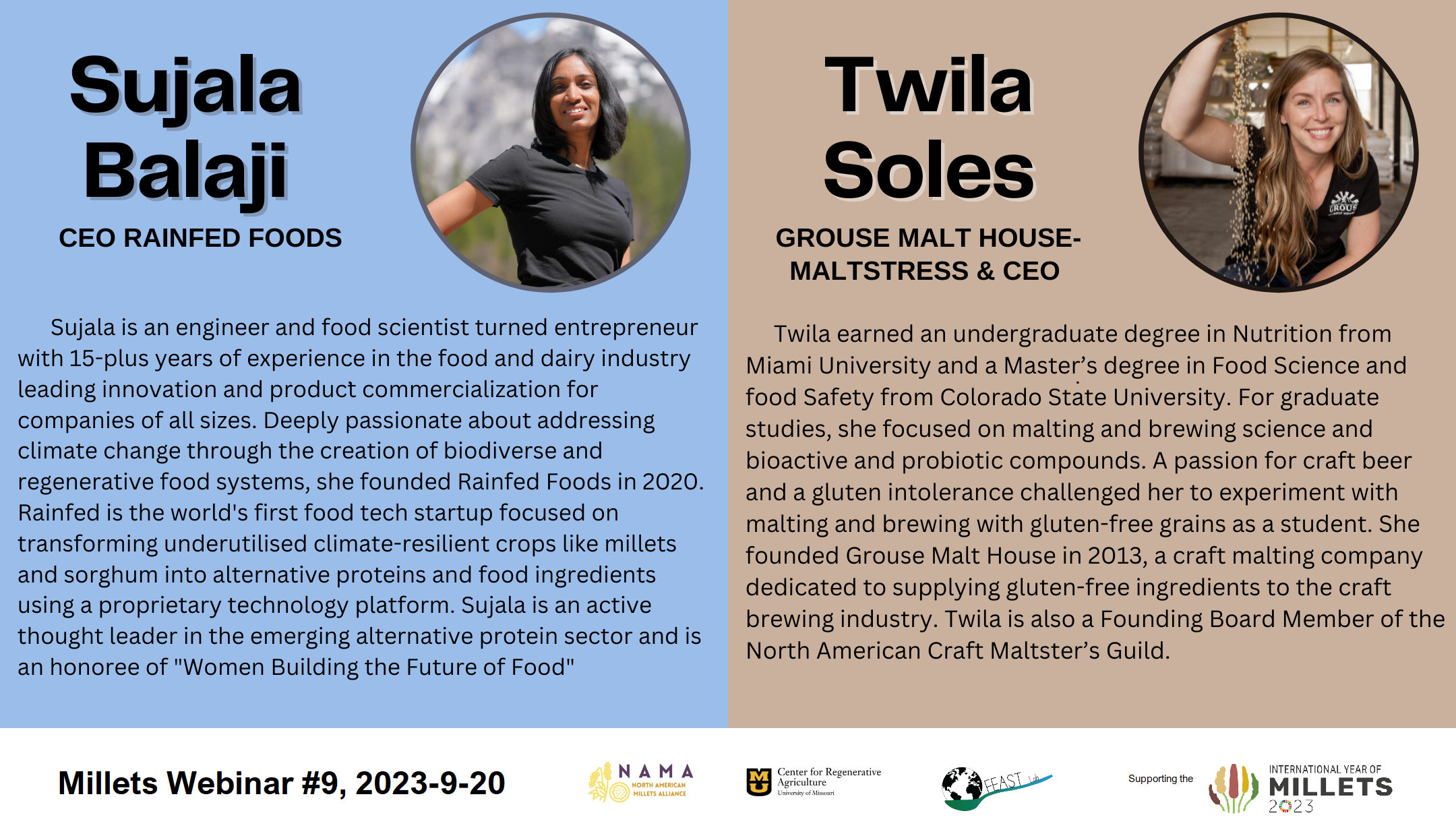 The North American Millets Alliance, the FEAST Lab at University of Missouri, and the Center for Regenerative Agriculture, also at the University of Missouri invite you to the 9th in our year-long series of monthly Millets Webinars during the International Year of Millets. It is this Wednesday, 20 September at 5-6 pm EDT. The Webinar theme this month is "Drink up! Millet beverages, alcoholic & non-alcoholic," and it will feature presentations by two experts, followed by Q&A: * Sujala Balaji, engineer, scientist, entrepreneur, & founder/CEO of Rainfed Foods, will present on "Millets' role in next gen plant based food and beverage innovation." One of their products is a milk from millets * Twila Soles, CEO and maltstress at Grouse Malt House, will present on "Exploring Millet As a Craft Brewing Ingredient." One of the grains they use is proso millet. Beverages made with millets is a topic that doesn't seem to be getting as much attention as it merits in this International Year of Millets. Traditional beers and malted drinks made with one or another of these grains remain important in parts of Asia and Africa. This webinar will focus on a couple of contemporary uses, from Canada and the US. If you are not already registered for the Millets Webinar Series, you may sign up at: https://umsystem.zoom.us/meeting/register/tJctduutrTgoGNLZnrkxtUw614DEjAT3Sg... For past editions of our Millets Webinar, please see: https://www.youtube.com/playlist?list=PLy7IvZCKUBap-6AaoCjPSFTMMq772t_Yb Don Osborn, PhD (East Lansing, MI, US) North American Millets Alliance (co-founder)