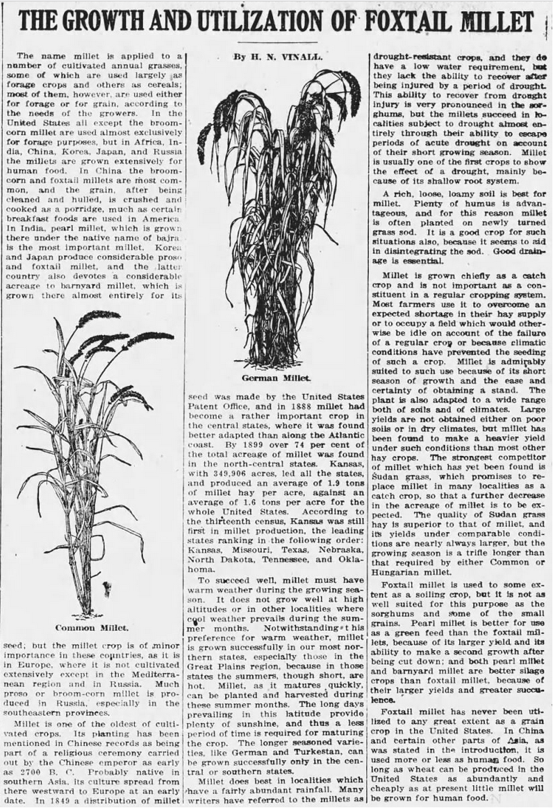Since I was a bit behind with the foxtail millet "millet-of-the-month" post, I might as well follow up with a century-old article about this grain. This piece was apparently syndicated, appearing in several local papers in the US around 1917. I found it interesting. You may judge how well it holds up after all this time. This particular version came from a paper in Lancaster, PA, accessed via Newspapers.com./1 An image is attached, and the text from a surprisingly good OCR (which I quickly corrected) follows below. The author, Harry N. Vinall, wrote a number of crop bulletins,/2 of which one of them with the same title as this article goes into more depth on the subject./3 Don Osborn, PhD (East Lansing, MI, US) North American Millets Alliance Notes: 1. "Growth and Utilization of Foxtail Millet," by H.N, Vinall, Lancaster Intelligencer, 27 June 1917, p. 8 https://www.newspapers.com/article/lancaster-intelligencer-growth-utiliza/14... 2. https://onlinebooks.library.upenn.edu/webbin/book/lookupname?key=Vinall%2C%2... 3. https://catalog.hathitrust.org/Record/101804274 ----------------------- THE GROWTH AND UTILIZATION OF FOXTAIL MILLET By H. N. VINALL The name millet is applied to a number of cultivated annual grasses, some of which are used largely as forage crops and others as cereals; most of them, however, are used either for forage or for grain, according to the needs of the growers. In the United all except for the broomcorn millet are used almost exclusively for forage purposes, but in Africa, India, China, Korea, Japan, and Russia the millets are grown extensively for human food. In China the broomcorn and foxtail millets are most common, and the grain, after being cleaned and hulled, is crushed and cooked as a porridge, much as certain breakfast foods are used in America. In India, pearl millet, which is grown there under the native name of bajra is the most important millet. Korea and Japan produce considerable proso and foxtail millet, and the latter country also devotes a considerable acreage to barnyard millet, which is grown there almost entirely for its seed; but the millet crop is of minor importance in these countries, as it is in Europe, where it is not cultivated extensively except in the Mediterranean region and in Russia. Much proso or broomcorn millet is produced in Russia, especially in the southeastern provinces. Millet is one of the oldest of cultivated crops. Its planting has been mentioned in Chinese records as being part of a religious ceremony carried out by the Chinese emperor as early as 2700 B. C. Probably native in southern Asia, its culture spread from there westward to Europe at an early date. In 1849 a distribution of millet German Millet. seed was made by the United States Patent Office, and in 1888 millet had become a rather important crop in the central states, where it was found better adapted than along the Atlantic coast. By 1899 over 74 per cent of the total acreage of millet was found in the north-central states. Kansas, with 349,906 acres, led all the states, and produced an average of 1.9 tons of millet hay per acre, against an average of 1.6 tons per acre for the whole United States. According to the thirteenth census, Kansas was still first in millet production, the leading states ranking in the following order: Kansas, Missouri, Texas, Nebraska, North Dakota, Tennessee, and Oklahoma. To succeed well, millet must have warm weather during the growing season. It does not grow well at high altitudes or in other localities where cold weather prevails during the summer months. Notwithstanding this preference for warm weather, millet is grown successfully in our most northern states, especially those in the Great Plains region, because in those states the summers, though short, are hot. Millet, as it matures quickly, can be planted and harvested during these summer months. The long days prevailing in this latitude provide plenty of sunshine, and thus a less period of time is required for maturing the crop. The longer seasoned varieties, like German and Turkestan, can be grown successfully only in the central or southern states. Millet does best in localities which have a fairly abundant rainfall. Many writers have referred to the millets as drought-resistant crops, and they do have a low water requirement, but they lack the ability to recover after being injured by a period of drought. This ability to recover from drought injury is very pronounced in the sorghums, but the millets succeed in localities subject to drought almost entirely through their ability to escape periods of acute drought on account of their short growing season. Millet is usually one of the first crops to show the effect of a drought, mainly because of its shallow root system. A rich, loose, loamy soil is best for millet. Plenty of humus is advantageous, and for this reason millet is often planted on newly turned grass sod. It is a good crop for such situations also, because it seems to aid in disintegrating the sod. Good drainage is essential. Millet is grown chiefly as a catch crop and is not important as a constituent in a regular cropping system. Most farmers use it to overcome an expected shortage in their hay supply or to occupy a field which would otherwise be idle on account of the failure of a regular crop or because climatic conditions have prevented the seeding of such a crop. Millet is admirably suited to such use because of its short season of growth and the ease and certainty of obtaining a stand. The plant is also adapted to a wide range both of soils and of climates. Large yields are not obtained either on poor soils or in dry climates, but millet has been found to make a heavier yield under such conditions than most other hay crops. The strongest competitor of millet which has yet been found is Sudan grass, which promises to replace millet in many localities as a catch crop, so that a further decrease in the acreage of millet is to be expected. The quality of Sud
