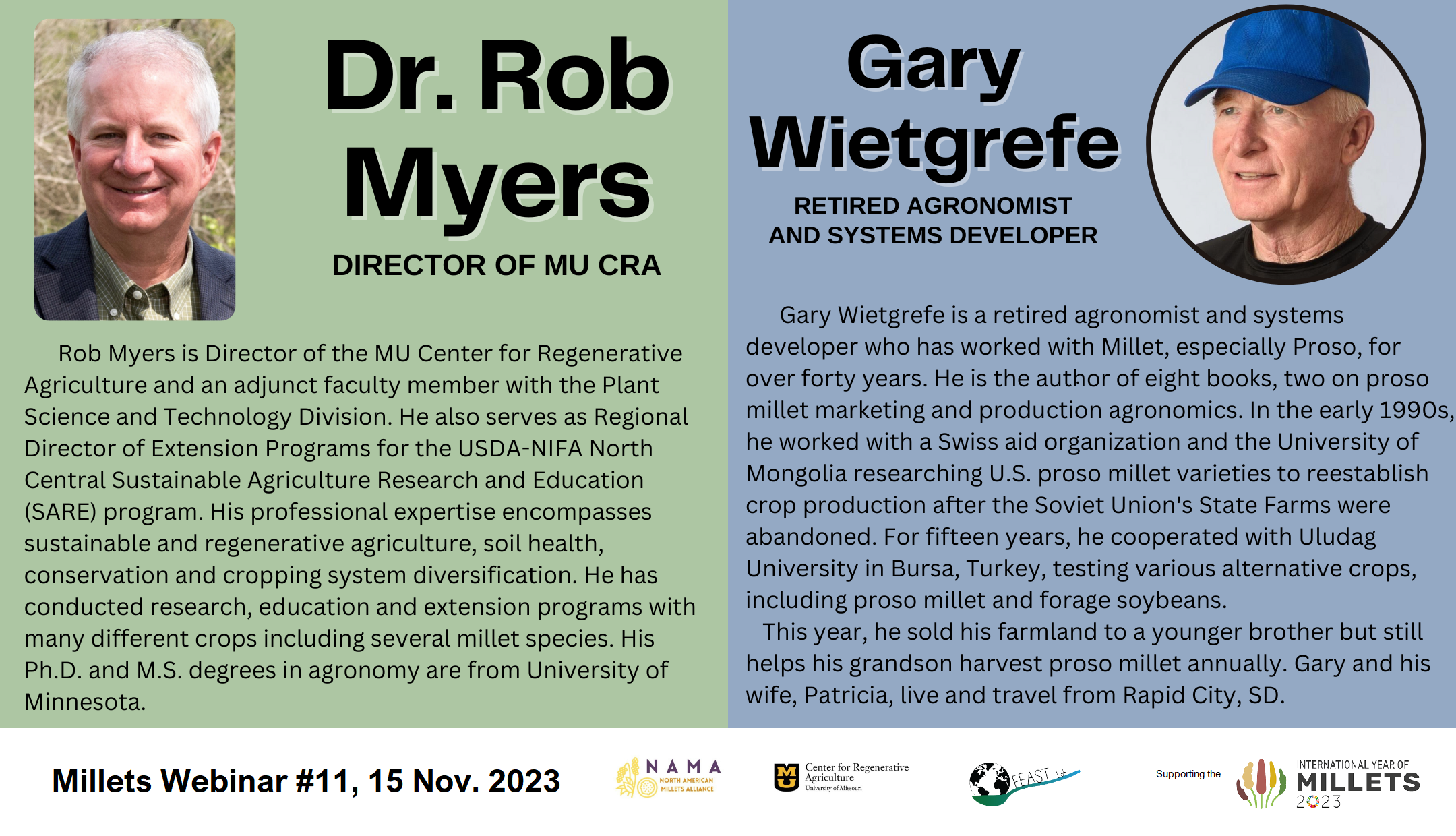 Save the date! The 11th in our monthly Millets Webinar Series, on Wednesday 15 Nov. at 5 pm EST, has as its core theme, "Not just for the birds: Millets and animal farming" (altho we will range a bit more widely). It will feature presentations by two experts, followed by Q&A: * Dr. Robert Myers, Dir. of the University of Missouri Center for Regenerative Agriculture and adjunct faculty in Plant Science and Technology Division, also at MU, who has expertise on sustainable ag and crop diversification, including many years work with several millets. In this return to the Millets Webinars, he will present on "Millets used for cover crops, songbirds, and waterfowl.” * Gary Wietgrefe, retired agronomist, also with a long career in which he has dealt with millets both domestically, in South Dakota, and internationally. He is currently researching the less-documented degree to which millets are cultivated for purposes other than grain, and will present on "U.S. millet for forage, conservation, wildlife, and ornamental uses." This month we are turning from our focus on millets as food, to consider the surprising range of other uses of millets in North America - on farms (for feeding animals and as cover crops), in wildlife areas, and in other settings. While the number of acres planted in millets for human consumption (mainly sorghum, proso millet, and teff) is relatively limited, several species of millets are planted in this region for other purposes on a large area. This is a testament both to the versatility of millets and the ingenuity of farmers and researchers. Could this wide and apparently extensive use facilitate future introduction of food-grade varieties of more millets into agriculture and food systems here? If you are not already registered for the Millets Webinar Series, you may sign up here: https://umsystem.zoom.us/meeting/register/tJctduutrTgoGNLZnrkxtUw614DEjAT3Sg... For past editions of our Millets Webinar, please see: https://www.youtube.com/playlist?list=PLy7IvZCKUBap-6AaoCjPSFTMMq772t_Yb The Millets Webinar Series is being organized during the International Year of Millets (2023) by the North American Millets Alliance (NAMA) and the Food Engineering and Sustainable Technologies (FEAST) Lab at the University of Missouri, with additional support from the Center for Regenerative Agriculture, also at the University of Missouri. DO, EL, MI, US NAMA