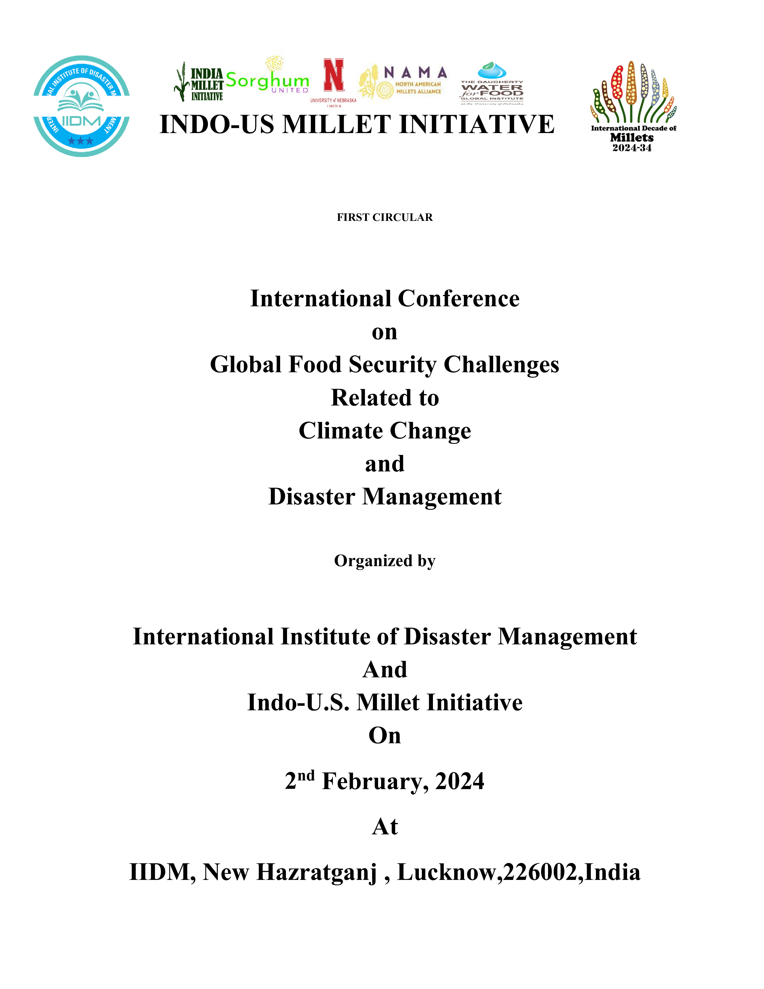 The "International Conference on Global Food Security Challenges Related to Climate Change and Disaster Management" (Friday 2 February 2024) is organized by the International Institute of Disaster Management (Lucknow, India) and the Indo-U.S. Millets Initiative. The conference is in-person in Lucknow, and virtual, via Zoom. This link has the Zoom link, as well as a list of presenters and their topics: https://www.signupgenius.com/go/10C084DABAA29A0F9C34-47081833-international#... The first presentation is scheduled for 11 am India time, which is 12:30 am EST, on Friday (i.e., just after Thursday midnight). Don Osborn, PhD (East Lansing, MI, US) North American Millets Alliance