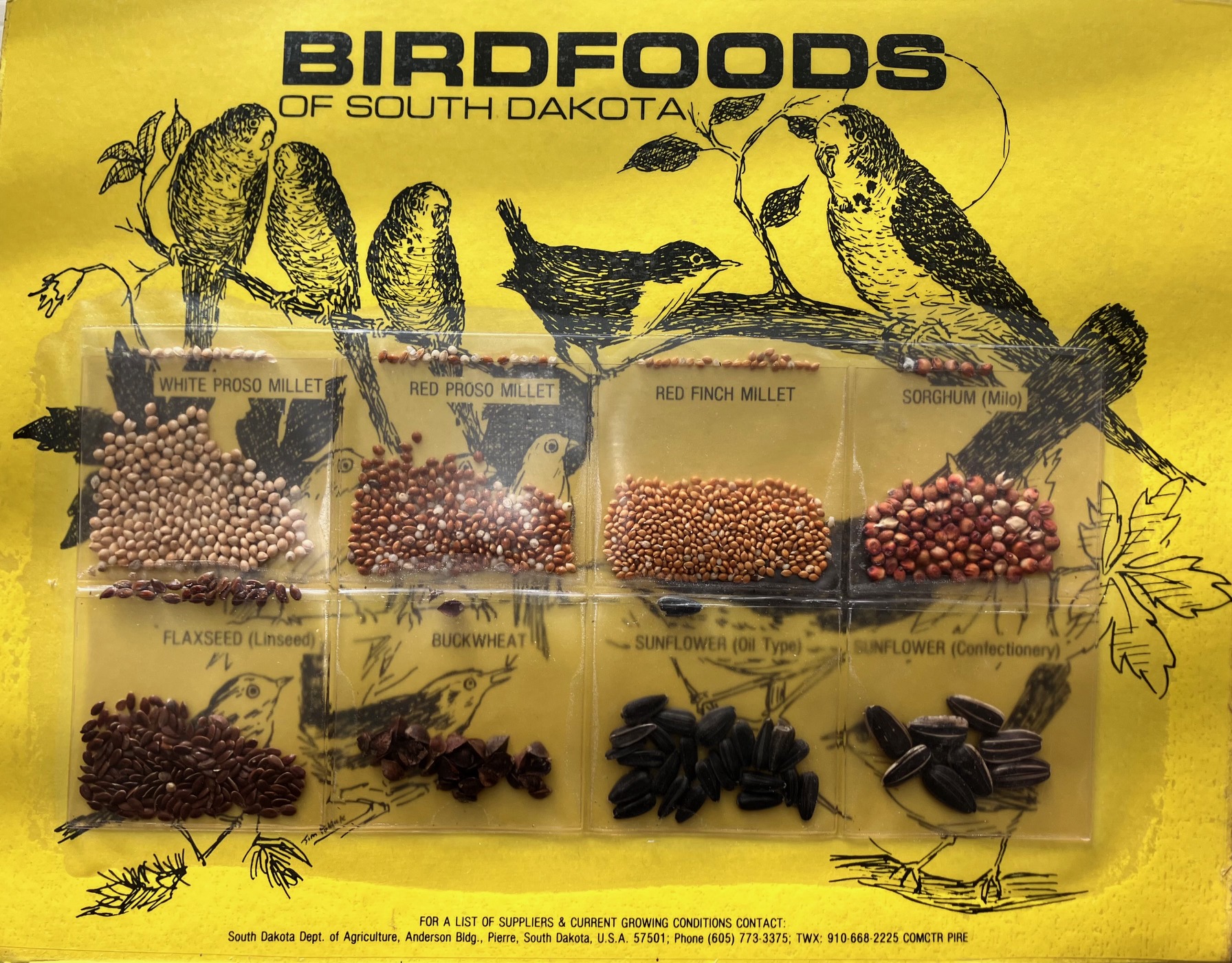 Action: First, I figured out who were the local proso buyers. I connected them with a Canadian exporter who shipped proso through the Great Lakes to Europe (replacing Argentine yellow plata) in the spring of 1979. Secondly, I realized the biggest potential U.S. users of proso were bridseed packagers. With the help of a local sketch artist, Jim Pollock, and my administrative assistant, Deenie Frederick (who by the way introduced me to my wife of 39 years), helped me make a mailer of "*Birdfoods of South Dakota*" (attached photo you may have noticed on my bookshelf in today's Zoom). Mr. Pollock drew sketches of birds, I collected birdseeds we grew, and Deenie and I cut 2x2" slide holders, filled them with birdseeds, glued them to yellow cardstock with bird sketches, then laminated it. We made 100 and mailed them to all the birdseed packagers, distributors, and SD buyers...and had a few left over including the attached.