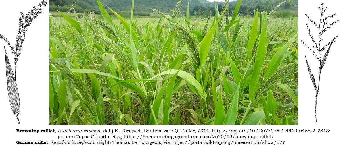 Two #millets share the spotlight as September's "millet-of-the-month": browntop millet and Guinea millet. Both are in the genus Brachiaria (or Urochloa). Browntop millet (B. ramosa) is native to South or Southeast Asia, and is a cereal crop in that region (notably in India). In North America it is also called Dixie signalgrass, and is currently grown mainly in the SE US, for wildlife, forage, and as a cover crop. Whole grain browntop millet for human consumption is packaged and exported from India on a small scale. * https://en.wikipedia.org/wiki/Brachiaria_ramosa * https://www.frontiersin.org/articles/10.3389/fsufs.2022.974126/full * https://plants.sc.egov.usda.gov/DocumentLibrary/plantguide/pdf/pg_urra.pdf Guinea millet (B. deflexa) probably originated in West Africa, and is now widely distributed in Africa and South Asia (and may be present in Florida and Alabama, per Kew.org). Its edible grains are a food source, but it is apparently cultivated as a crop only in the north of the Futa Jalon plateau of Guinea (and apparently is sometimes lumped together with fonio [Digitaria exilis], a major crop in that region). * https://en.wikipedia.org/wiki/Brachiaria_deflexa * https://www.dineshkhedkar.co.in/mpdb/record.php?act=view&id=MG007 Sources for components of the attached image (browntop in left & center; Guinea on the right): (left) Adapted from: Eleanor Kingwell-Banham and Dorian Q. Fuller (2014). Brown Top Millet: Origins and Development. In: Smith, C. (eds) Encyclopedia of Global Archaeology. Springer, New York, NY. https://www.researchgate.net/publication/286351352_Brown_Top_Millet_Origins_... (center) Tapas Chandra Roy. TCR Connecting Agriculture https://tcrconnectingagriculture.com/2020/03/browntop-millet/ (right) Adapted from: Image credited to Thomas Le Bourgeois, via https://portal.wiktrop.org/observation/show/377 Don Osborn, PhD (East Lansing, MI, US) North American Millets Alliance
