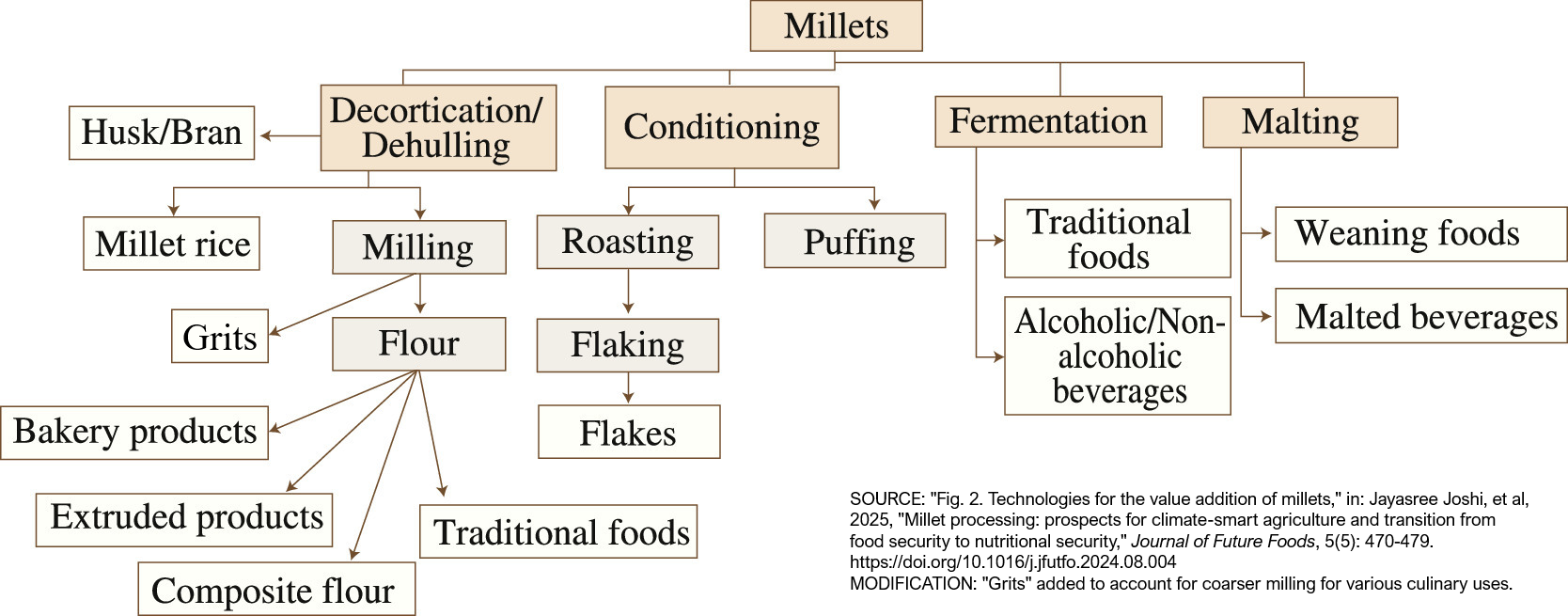 Figure 2 in the Jaasree Joshi, et al article is a diagram entitled "Technologies for the value addition of millets." I've taken the opportunity to make a small modification to the diagram, namely the addition of "Grits" as a product of milling. Here's the thinking behind this: A lot of our thinking about grains is fairly binary - they're either more or less whole or they're ground down into flour. Intermediate milling to produce "cracked" grains, grits, or semolina, is certainly known, but doesn't seem to be discussed much.