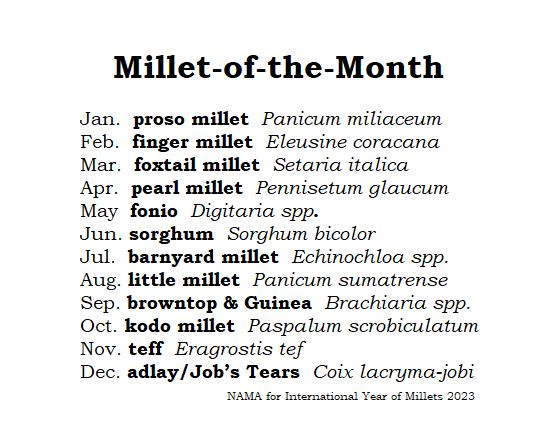 Sorghum (Sorghum bicolor) is our "millet-of-the-month" in June (the MotM calendar is appended and attached). Sorghum is also the "grain-of-the-month" of our friends at the Whole Grains Council. Sorghum, sometimes also called "great millet," is a grain with many varieties and uses, Its total global production is on the order of 60 million MT/year (which is maybe twice that of all other #millets combined, but less than a tenth of a major cereal like wheat or rice). Sorghum was first domesticated in Africa - probably somewhere in the eastern Sahel. It spread to Asia in ancient times, and is now a global crop. For more about sorghum: * Encyclopaedia Britannica (a brief intro): https://www.britannica.com/plant/sorghum-grain * WIkipedia (a longer intro): https://en.wikipedia.org/wiki/Sorghum_bicolor * Whole Grains Council: https://wholegrainscouncil.org/whole-grains-101/grain-month-calendar/sorghum... * National Sorghum Growers; Sorghum 101: https://sorghumgrowers.com/sorghum-101/ * Sorghum Checkoff, Sorghum 101: https://www.sorghumcheckoff.com/sorghum-101/ * Healthline: https://www.healthline.com/nutrition/sorghum * Half-Scratched (recipes): https://www.halfscratched.com/sorghum-recipes/ (there are many sites online with sorghum recipes; this page lists 23 examples with photos, descriptions, outlinks for the actual recipes, so it seems a decent starting place) And see also the website of our friends at Sorghum United: http://sorghumunited.com/ ---------- The "millet-of-the-month" calendar, and how you can help The aim of "Millet-of-the-month" is to spotlight individual millets out of this often poorly understood group of grains. I do think that we have progressed from reference to "millet" (sounds like one thing, even if it is meant as a collective reference) to "millets" (okay, there are several of them), but that needs disambiguation. In some International Year of Millets publicity, one sees "millets" promoted, but that seems to beg the question: What are they? And the answers to that question most productively arrive at their individual identities: Where and under what conditions does each grow well? How does a particular millet work in cooking, and why might one choose one over another in a dish? What are their respective histories, and the cultures of farming and food that bring them to us? We're halfway through the calendar, and if you've been watching this space, you'll have noted that we (or mainly I) have been late each month to get info out on the current millet-of-the-month. And then that info is relatively limited in scope and reach. So here's the ask: If you have tie and interest, please consider posting on social media about the current "millet-of-the-month" - per the calendar below and in attachment - using the hashtag #milletofthemonth and the name of the month (and obviously the name of the millet, altho that may be in the item posted anyway). And, if you see such an item posted - such as on our twitter account at https://twitter.com/NAmericaMillets - feel free to repost it. Jan., proso millet, Panicum miliaceum Feb., finger millet, Eleusine coracana Mar., foxtail millet, Setaria italica Apr., pearl millet, Pennisetum glaucum May, fonio, Digitaria spp. June, sorghum, Sorghum bicolor July, barnyard millet, Echinochloa spp. Aug., little millet, Panicum sumatrense Sep., browntop & Guinea, Brachiaria spp. Oct., kodo millet, Paspalum scrobiculatum Nov., teff, Eragrostis tef Dec., adlay/Job’s Tears, Coix lacryma-jobi Thanks for considering helping us out with this. And try something new with sorghum! Don Don Osborn, PhD (East Lansing, MI, US) North American Millets Alliance