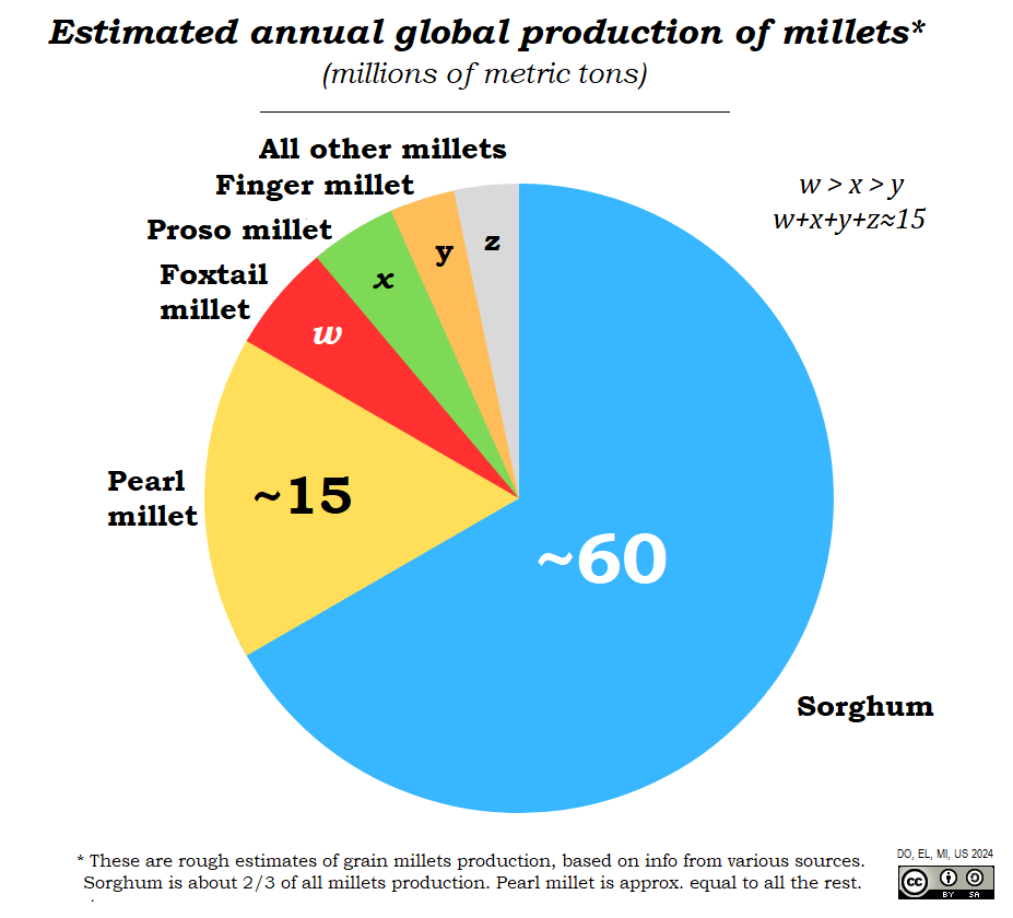 A couple of images of possible interest. The first is a square (pie) chart showing the relative harvested area for the world's crops. It was done by Benjamin Nowak, and can be seen at https://github.com/BjnNowak/TidyTuesday/blob/main/world_crops.png It is organized by botanical family, which itself is interesting, at least to some of us. When it comes to millets, however, we run into a familiar problem: they're collapsed under the title of one box - "millet," with the exception of sorghum, which of course is by itself the 5th most produced grain by volume. To be fair, dividing the "millet" box would result in some vey small boxes. Also - and this certainly is the overriding factor - the FAOStat data cited for this diagram does not For perspective, note the tiny box in the lower right for buckwheat (family, Polygonaceae). The two other pseudo cereals, quinoa and amaranth, would be in the box with sugar beets (family, Amaranthaceae). The second item, which is not nearly so ambitious, is the attached pie chart of relative production of millets, including sorghum. This is the second version of something I did earlier, but with only the two approximate figures that are documented - those for annual production of sorghum and pearl millet in millions of metric tons (depending on the grain, 1 mT ranges between about 36-46 bushels). There is a rough formula for the rest, for which I used variables and simple equations, so as not to give the impression that my guesses would have actual meaning. Sorghum grain production (around 60-70 million mT/yr) is said to be about twice that of all other millets, and pearl millet (around 14-15 million mT/yr) is said to be equal to that of the remaining millets combined. I recently saw 1909s figures estimating finger millet production to be about 3 mill. mT/yr. Also, the production ranking of the top 5 millets is: sorghum, pearl millet, foxtail millet, proso millet, and finger millet. From that we can construct a pie chart showing approximate relative production of millets. But yes, I'd like to get some good figures and redo the chart. Comments welcome of course, and please pass on (links to) any similar efforts you may have access to. Don Osborn, PhD (East Lansing, MI, US) North American Millets Alliance