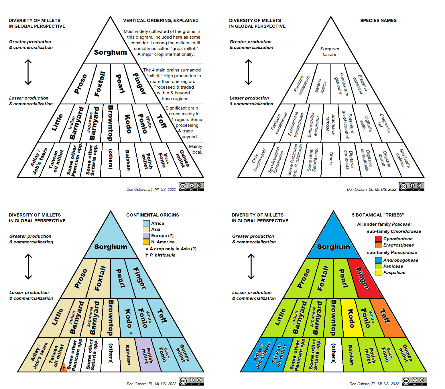 Thanks, Nate, and congratulations on the success of the Sorgho Squad series. Regarding development of markets for millets, here are a few thoughts - with the caveat that these are my ideas only, and I've had no formal training in marketing. We hear about the importance of a story in conveying an idea. The millet space, if you will, is complicated - in a good way - by the fact that there are many stories. Sorghum and teff, which are grown in this region, and fonio, which is imported, benefit from having their own one-word names ("millets-with-their-own-names"). For those surnamed millet, the challenges are first to create understanding that this is not one grain or one crop - which is why use iof the plural millets is a good starting point - and second, to fill out the identities of others. One way to approach the challenge of individual identities of the " grains-surnamed-millet" is to put them in the same room, as it were. That way the identities within the group can be made more clear (and no one can ask, "Have you ever noticed that we never see x-millet and y-millet in the same place at the same time? ..."). That's one reason I tried converting a list of the various millets into the "millets triangle" (current version attached; a slight revision is in the works). There could be other approaches as well. With that understanding in the background, one can spotlight individual millets. That's part of the rationale behind the "millet-of-the-month" calendar. Each month is a chance to focus on one millet, or a couple that are very close, in some depth. (By the way, in November, it's teff.) We didn't have the time or resources to make much of this approach this year, unfortunately. But I'm hoping we can do more in 2024, perhaps in connection with the "second season" following this year's Millets Webinars. We're under no illusion that all of the millets will achieve comparable levels of interest or popularity in North America. At this stage there's already a big difference among them in degree of global production (sorghum by itself, while an order of magnitude less important than any one of the major cereal grains, is twice as big as all the other millets combined, and among the latter, pearl millet is equal to all the rest - rough pie chart attached). Looking to the future, it's not possible to say which of the millets might become more popular. Sorghum has the pole position (or maybe is starting on second base - choose your sport analogy), and proso millet is well-established in this region, with teff having come up very quickly in the 4 decades or so since it was introduced here. Production and supply chains are in place - altho for dehulling proso there are apparently gaps in the system - and are presumably scalable.. Also, various enterprises are using these in consumer food products, but for relatively small markets. Many other millets - which have their own flavors, nutritional profiles, and culinary qualities - come to our stores and plates via imports. Most of these sell mainly to communities whose food culture involves use of these, but the breakout example of West African fonio - altho relatively small - shows what might be possible. What's interesting, I think, is that a number of these other millets that we get in food-grade form via imports are already grown in North America, as cover crops, for forage, and other purposes (but not all - fonio is not). These other purposes (this will be the topic of the next Millets Webinar on Nov. 15, BTW.. Could food-grade varieties of any of these be developed for this region? A key question, IMO, is whether such would be available for growers at such time as climate change and limited water require reduction of irrigated crops? So the approach to market demand would ultimately vary by grain - the many stories mentioned above - while I see NAMA's overall strategy as supporting all, and the organizations that promote them, promoting awareness, and organizing & providing information. In the immediate term, I'm thinking (without much evidence) that there is room for all to grow, so that promoting sorghum, proso, and teff, along with imported millets, will not put those interested in one or another in competition. But here's a question: is there a competition among say sorghum and proso millet for the attention of growers - do the markets compete? (The two are not really substitutable.) The main competition might be with major cereal crops (whether as food or as feed for livestock). However, in the longer term, if there are more types and varieties of millet on the market, perhaps there will be a competition among these for consumer attention. Anyway, we are looking at changes in agriculture and food culture in several respects. Thanks to the efforts of many people and organizations, such as you and Sorghum United, to promote the diverse millets during this International Year, they are more fully part of the conversation. We'll need to evaluate this (a separate discussion), but in any event, this is an ongoing effort and long process. Your efforts, Nate, on Sorgho Squad fit nicely in this context. Are you considering expanding this story concept to include other millets? Or developing parallel story lines that might intersect? This may not work, but one could imagine a kind of millets version of the "Marvel Cinematic Universe." Just so long as we don't end up with just a bunch of minions, or something like "Sorgho and the 19 Dwarves." So far, efforts to animate millets or heros promoting them have been limited, and I'm not sure if the effectiveness of those has been evaluated. All the best, Don DO, EL, MI, US NAMA On Tue, Nov 7, 2023 at 6:50 PM Sorghum United via Collab < collab@lists.millets2023.space> wrote: